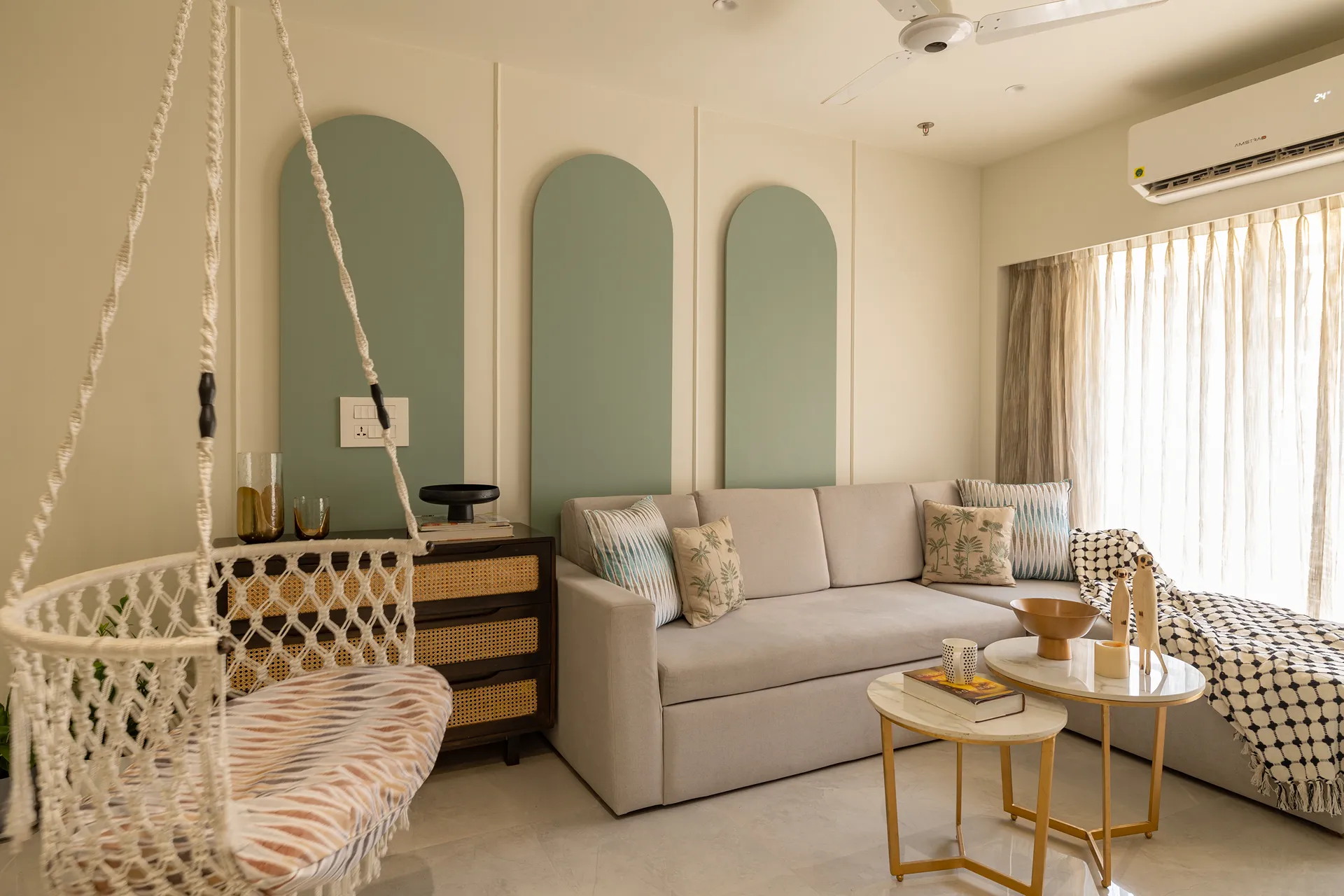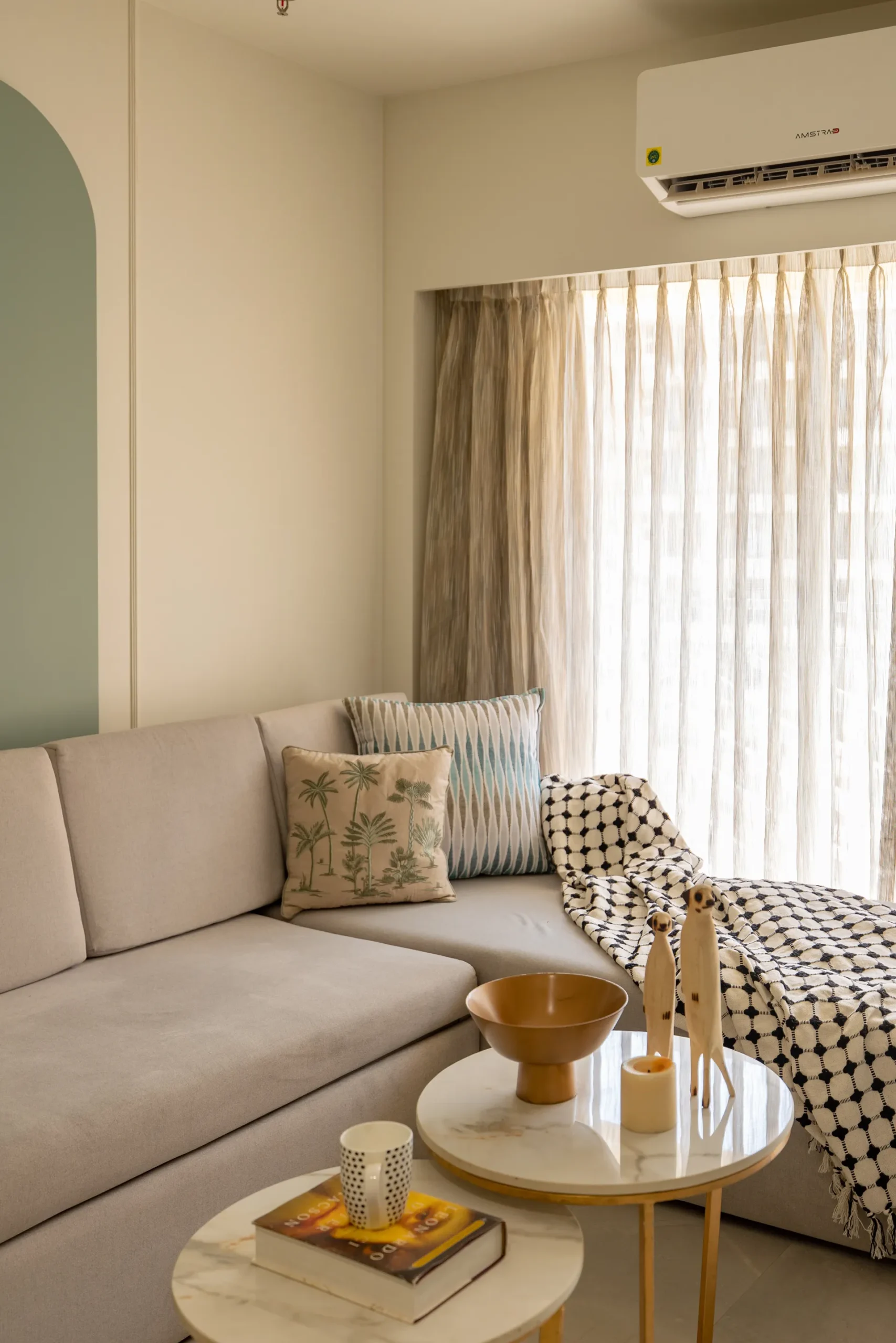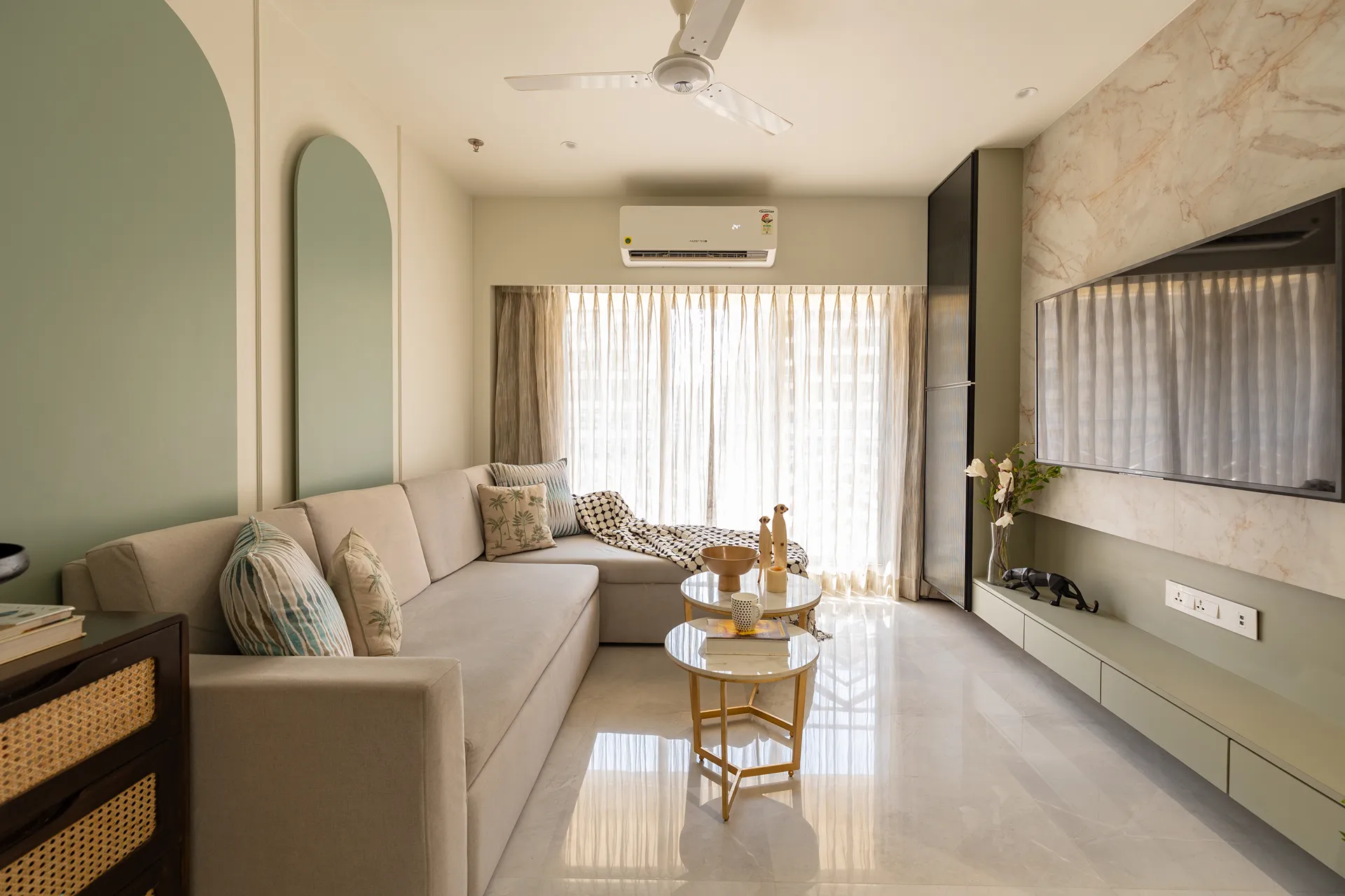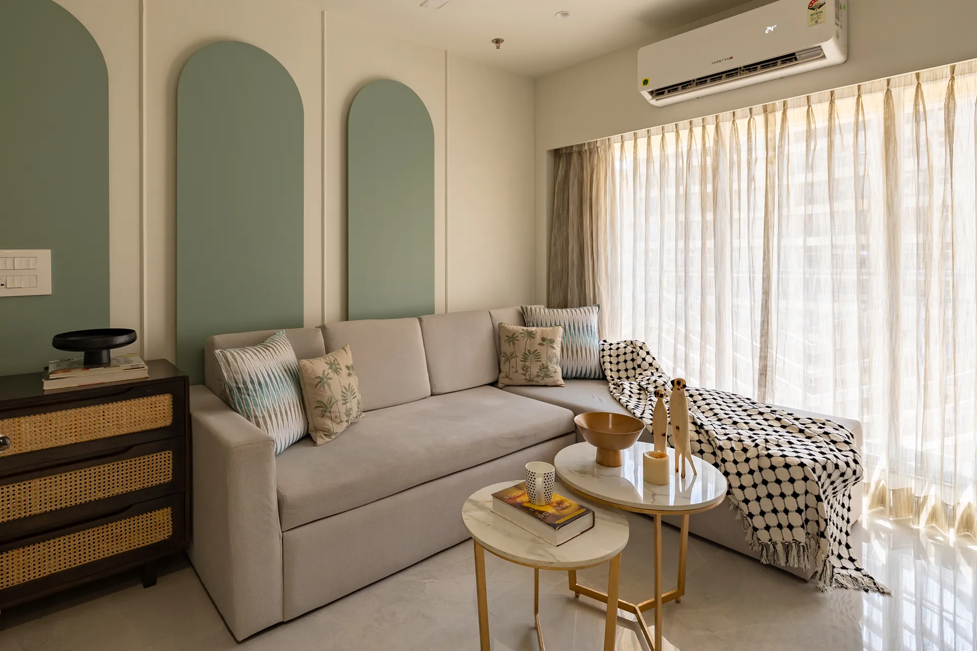 This 2BHK Mumbai apartment was reimagined to meet the storage and lifestyle needs of a family of five while maintaining an open, welcoming, and visually soft environment. Arches, nature-inspired tones, and carefully layered textures create a sense of calm and connection with nature, turning a compact space into a serene oasis.