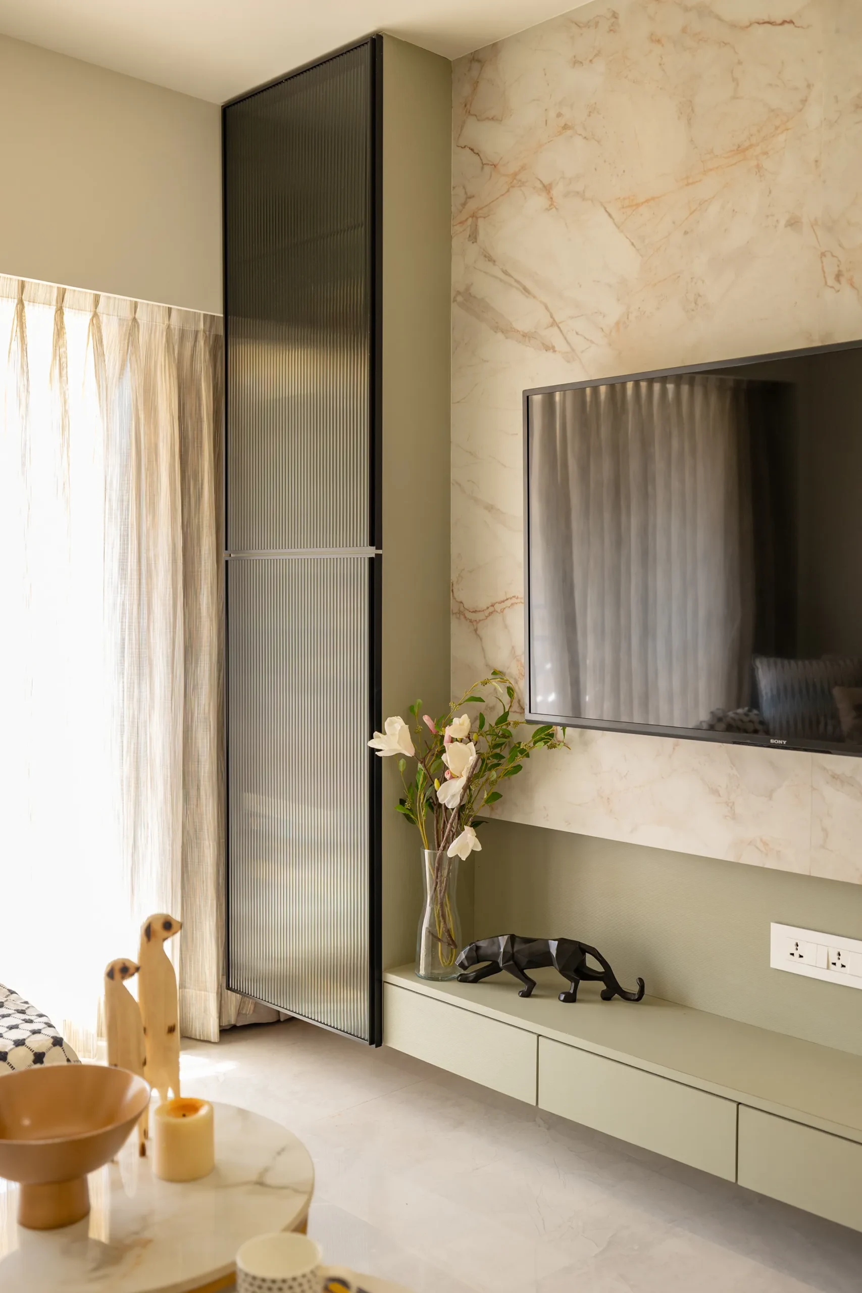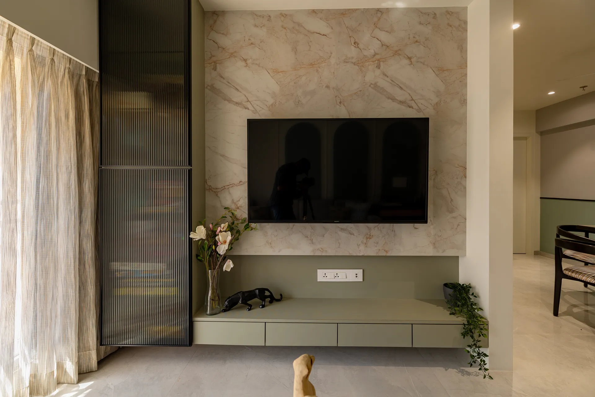 • TV unit with soft-textured marble-printed tiles and Pichwai painting integration