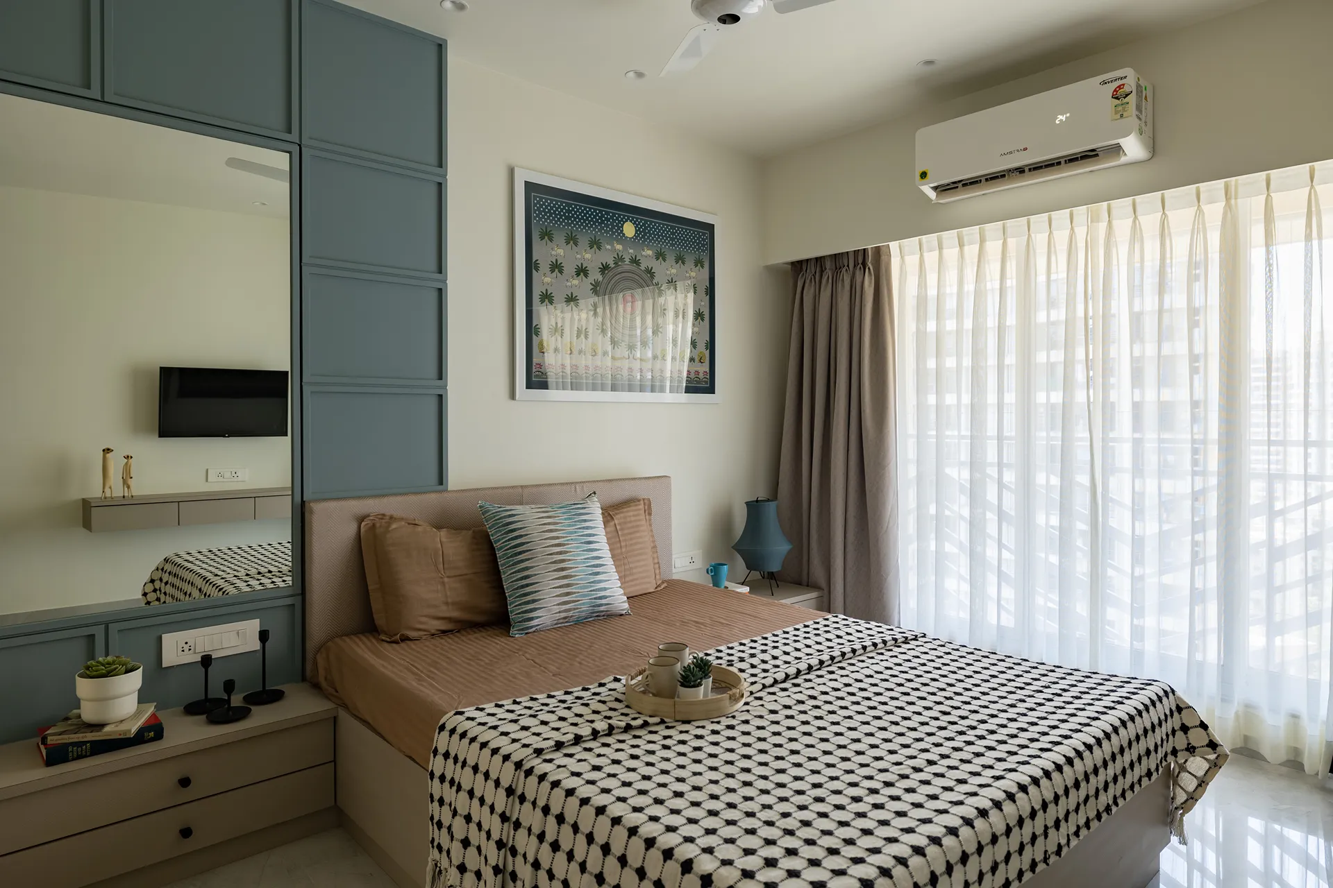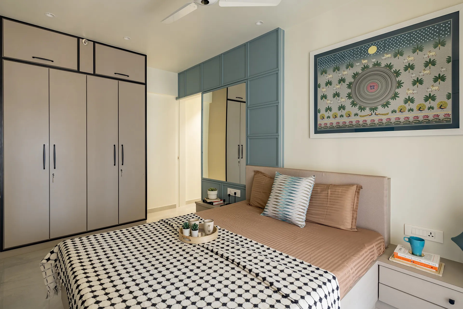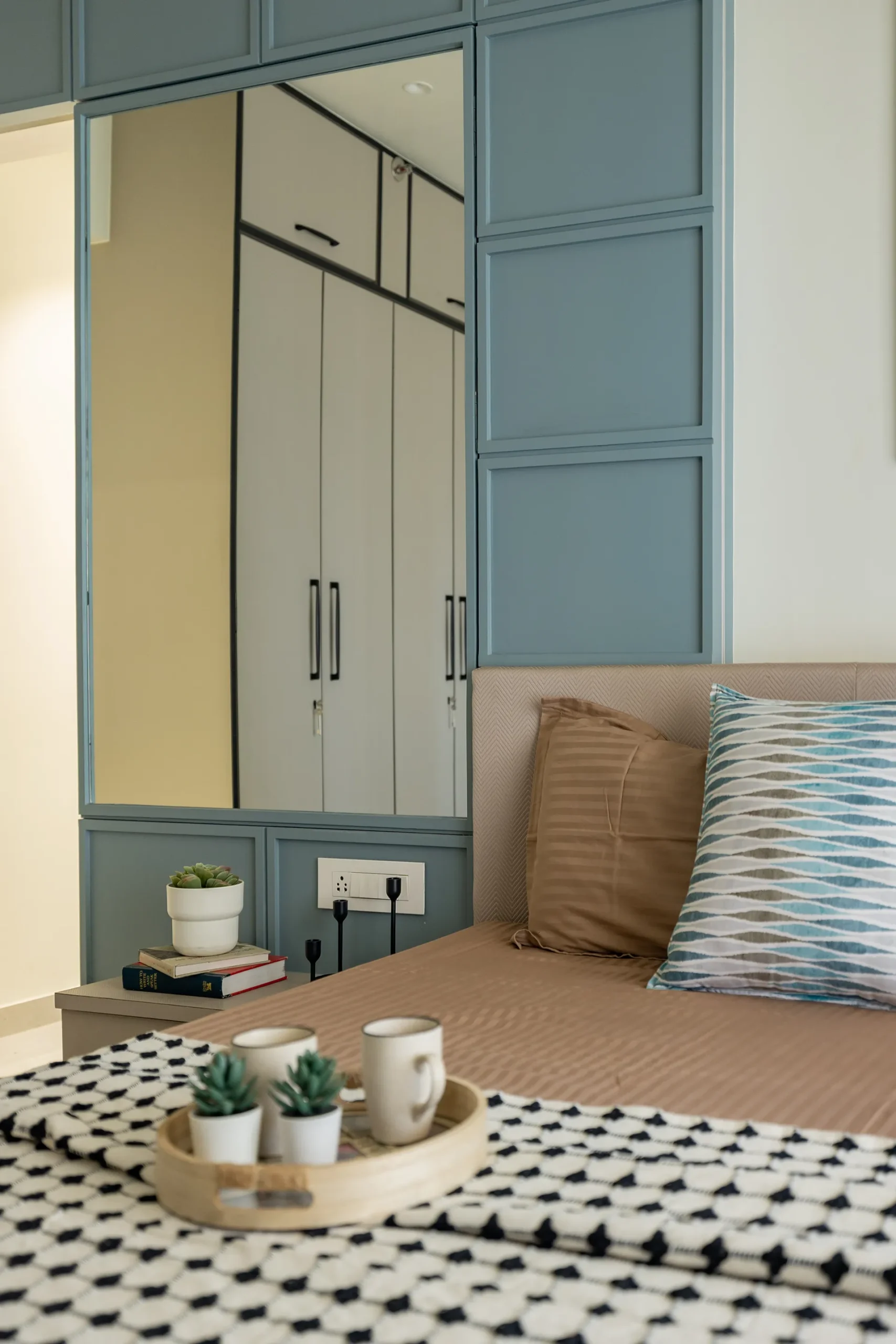 • Parents’ bedroom in calming earthy tones with a dual-purpose blue wall/mirror