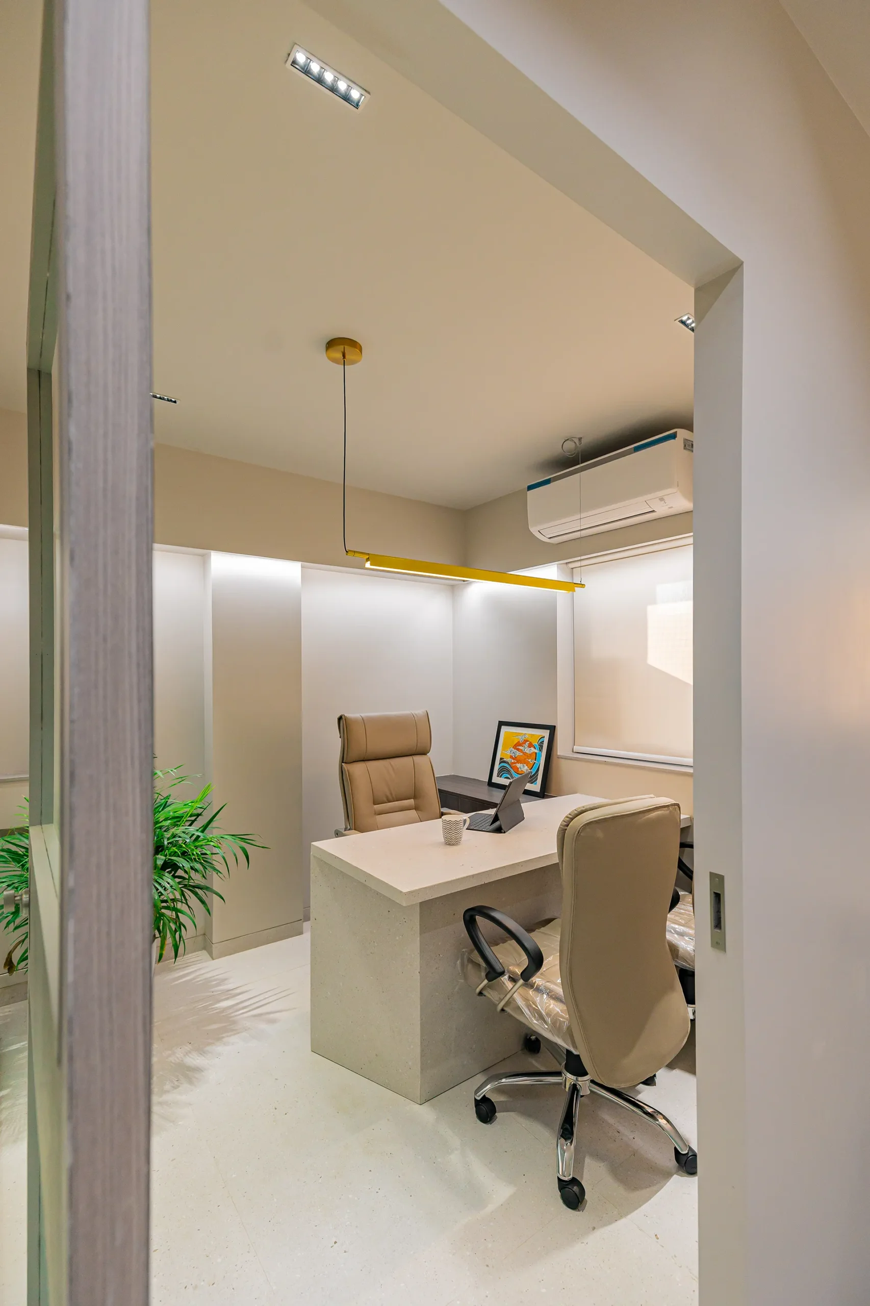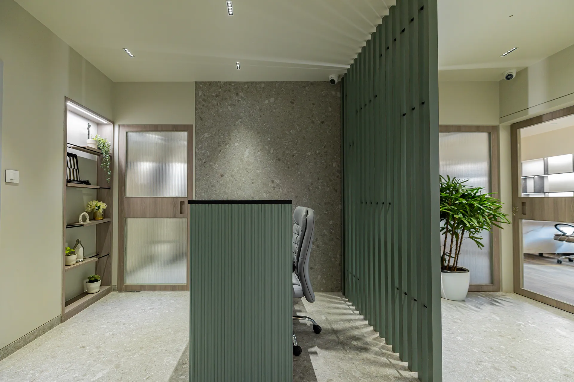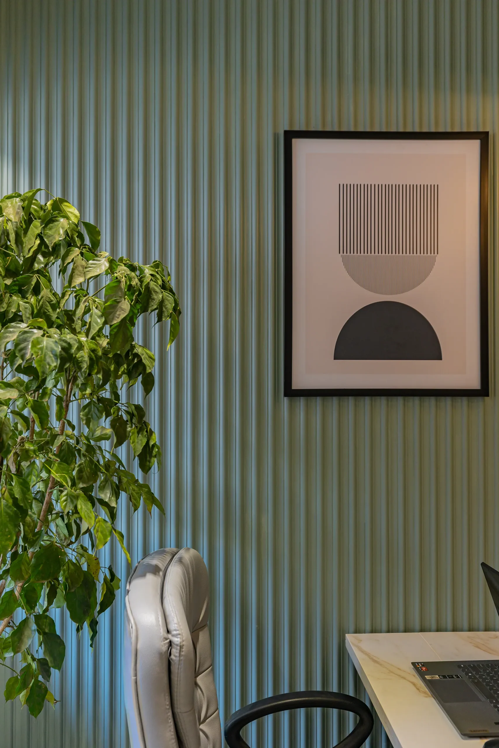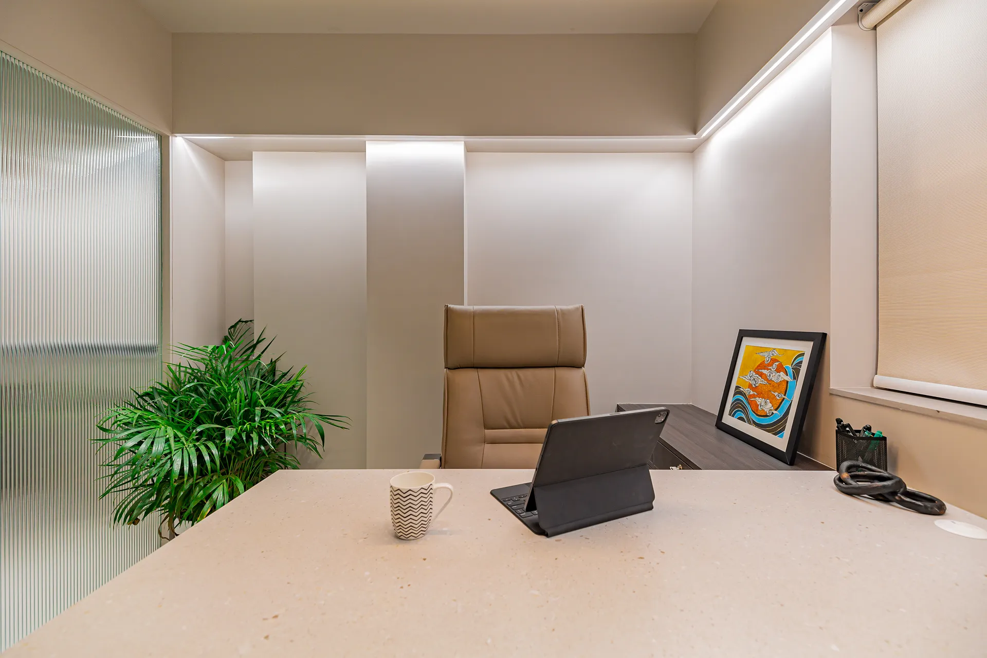 - Sensory Accents: In a space defined by a monochromatic base, we used natural plants and curated art as intentional “eye-breaks.” These organic elements provide a soothing contrast to the disciplined architectural lines.