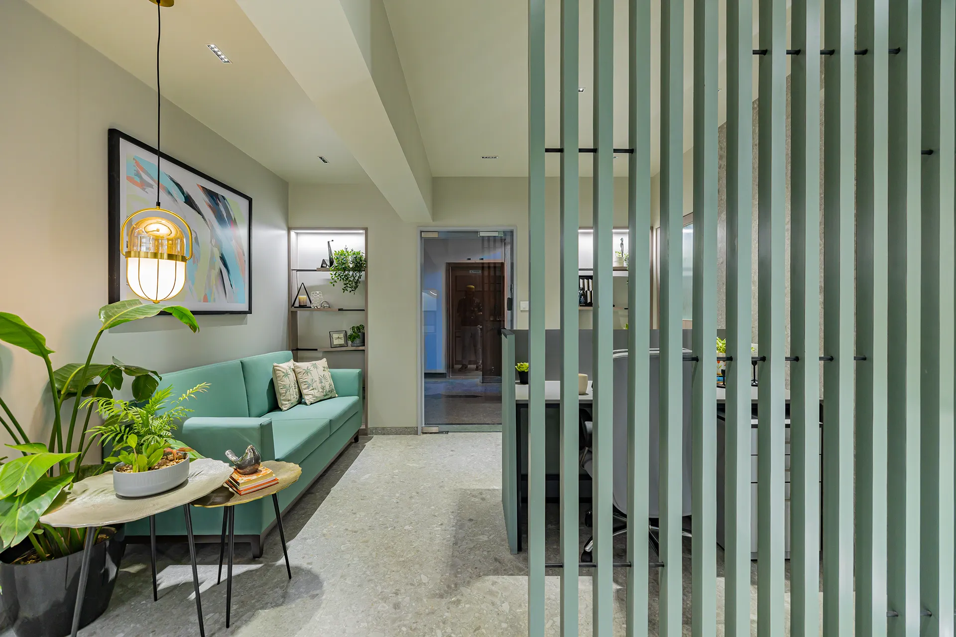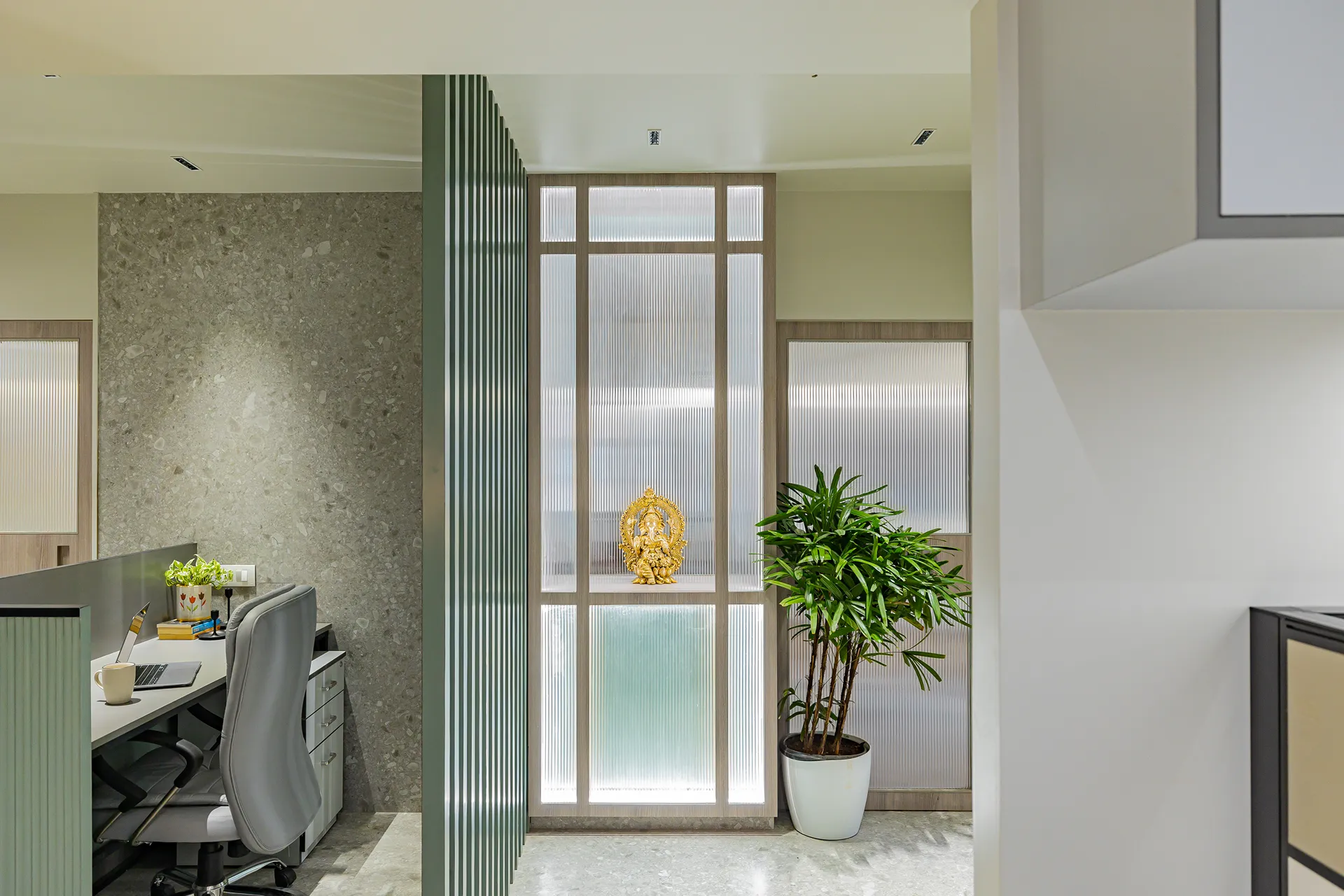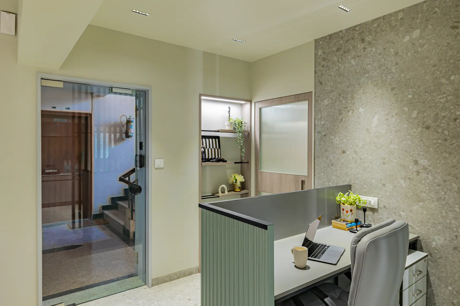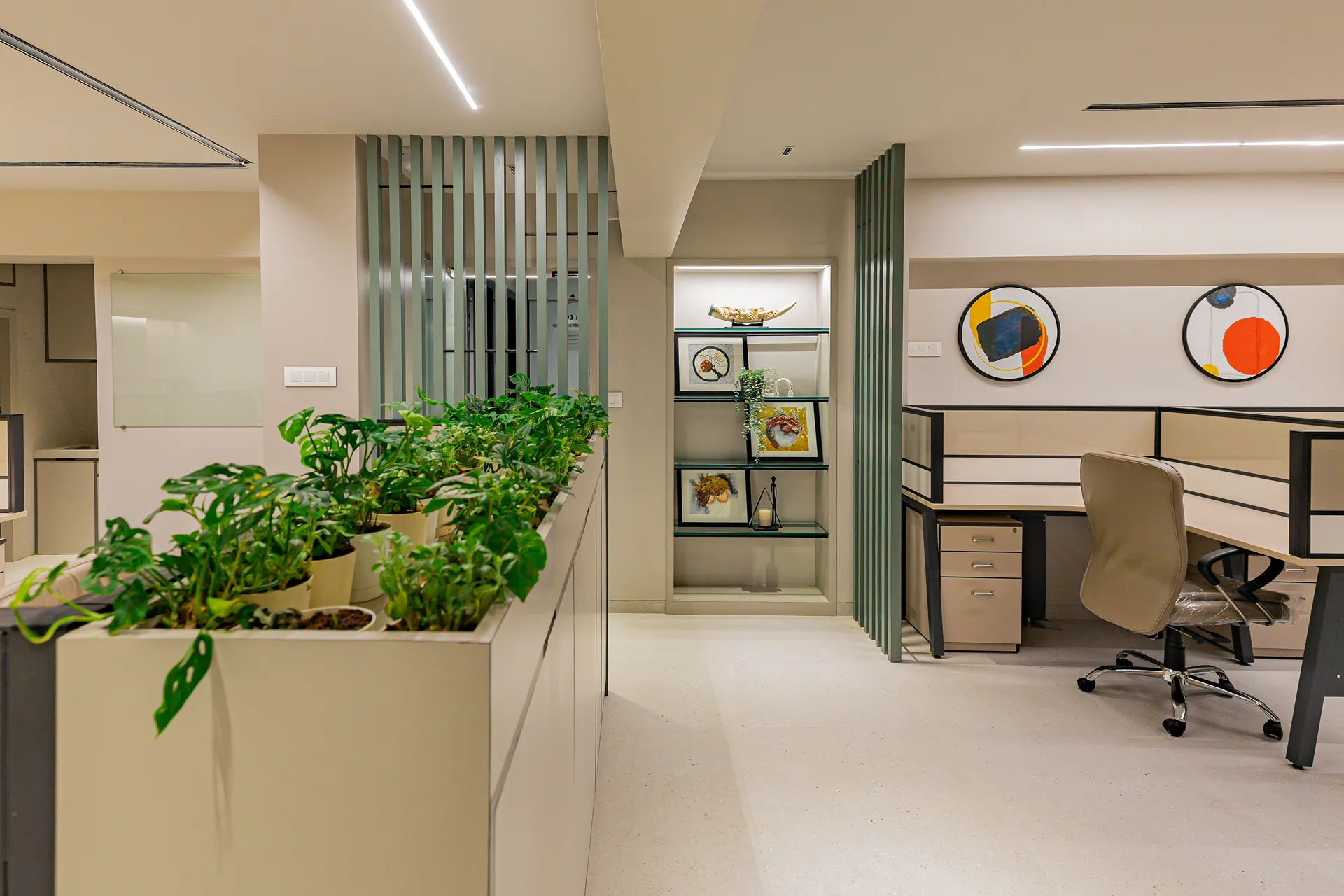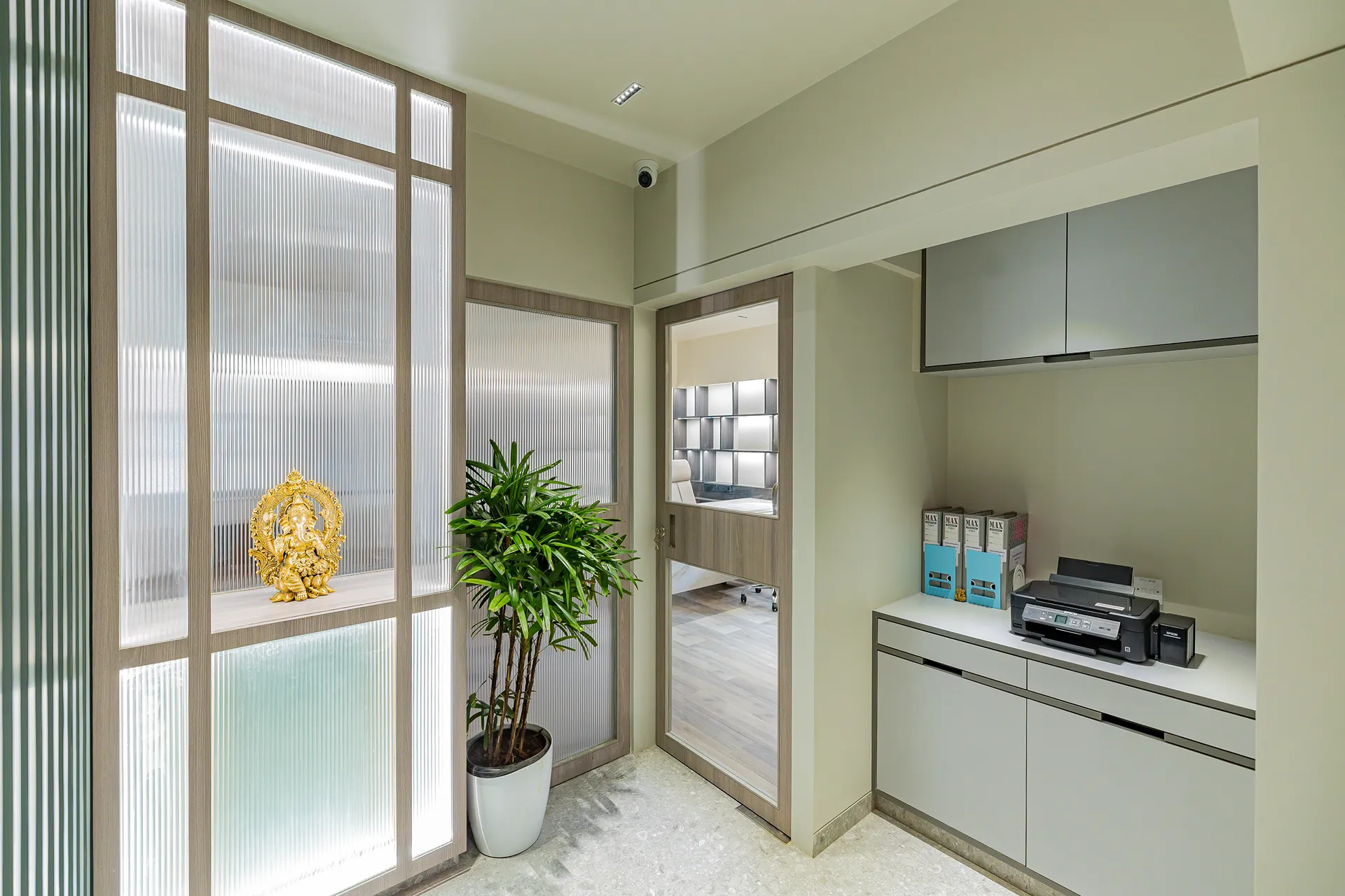 - Sensory Accents: In a space defined by a monochromatic base, we used natural plants and curated art as intentional “eye-breaks.” These organic elements provide a soothing contrast to the disciplined architectural lines.