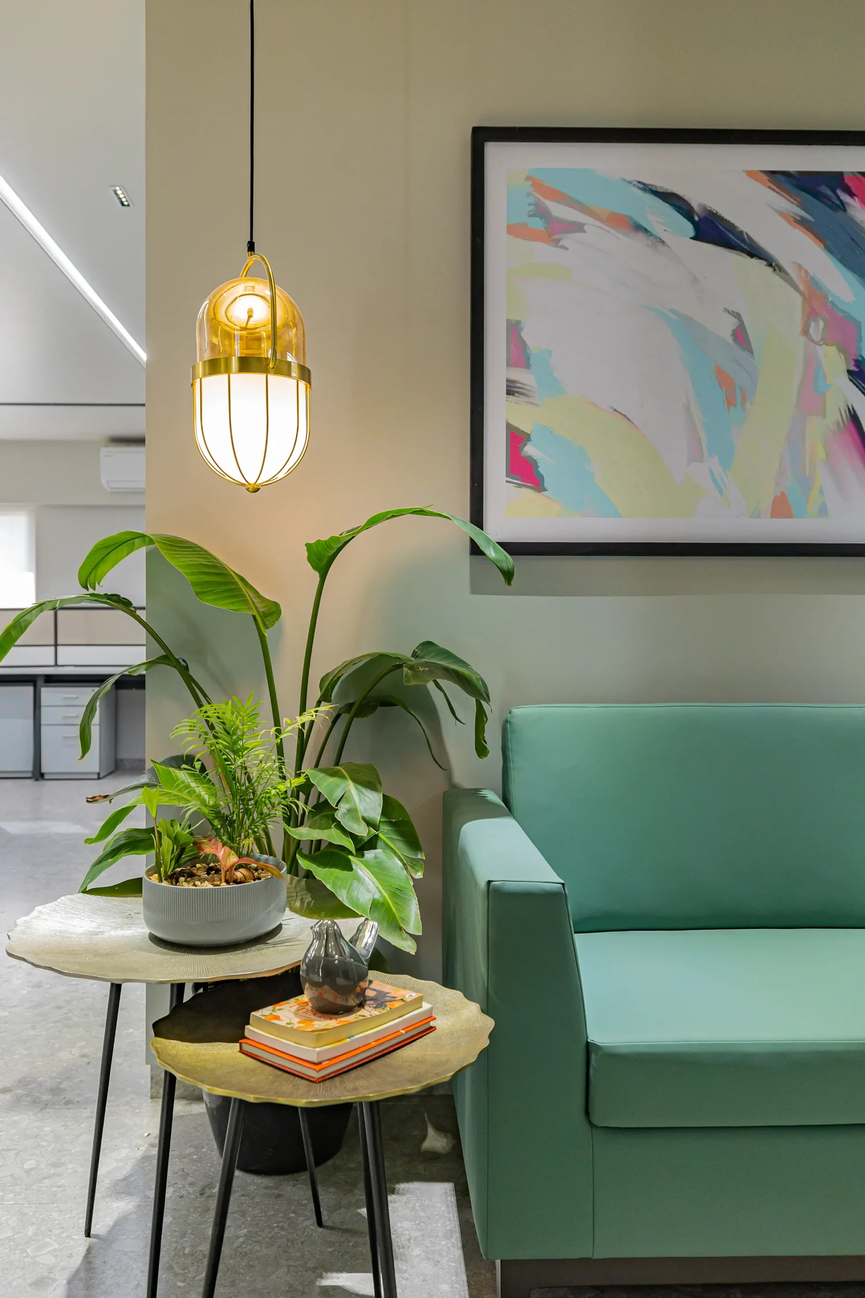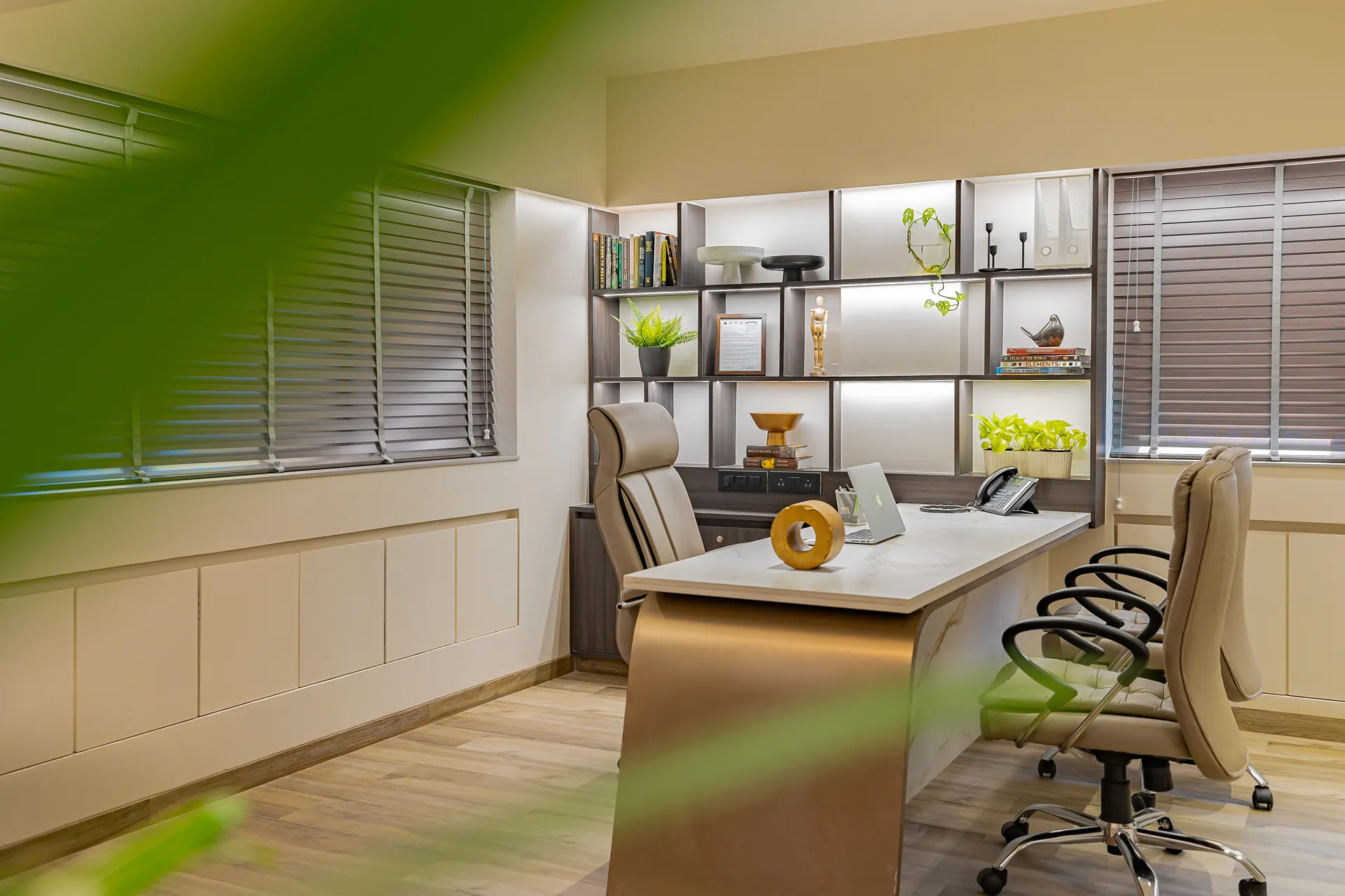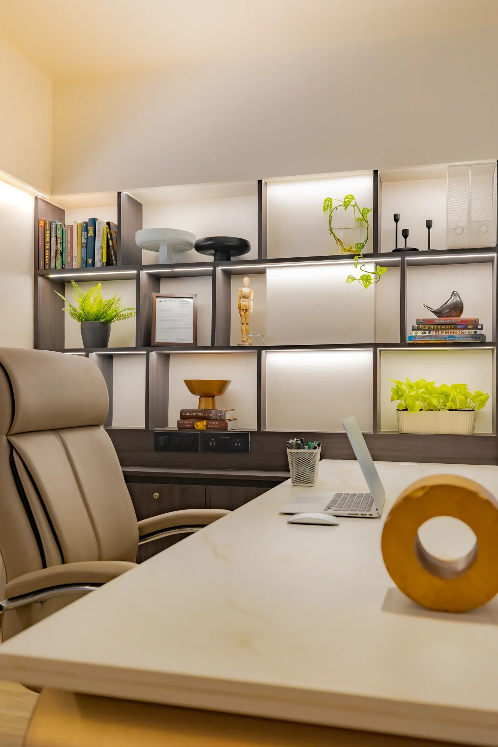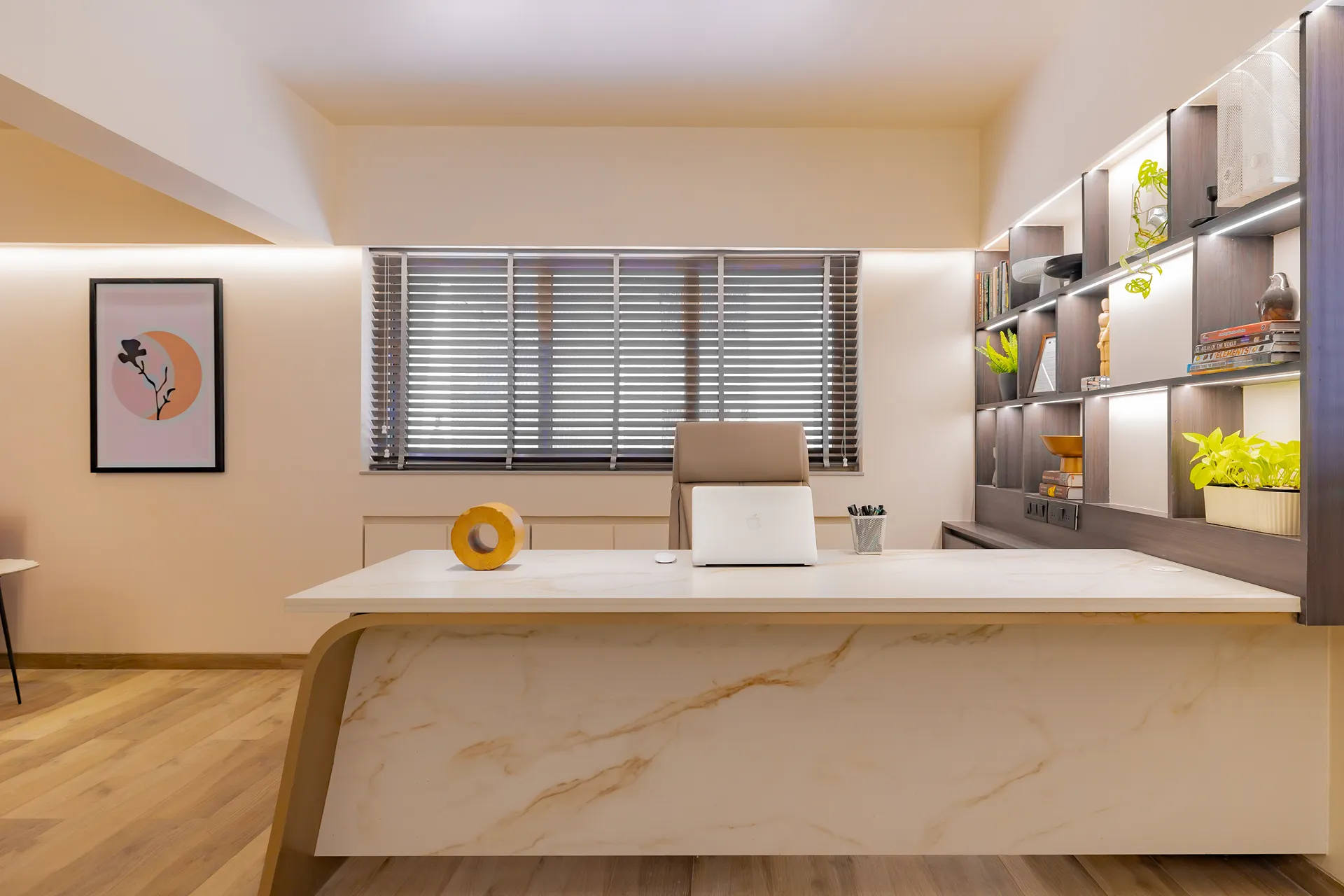 - Sensory Accents: In a space defined by a monochromatic base, we used natural plants and curated art as intentional “eye-breaks.” These organic elements provide a soothing contrast to the disciplined architectural lines.