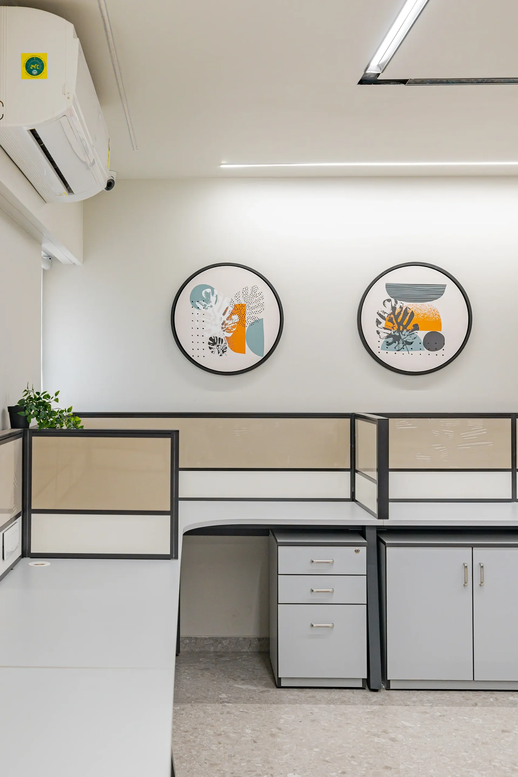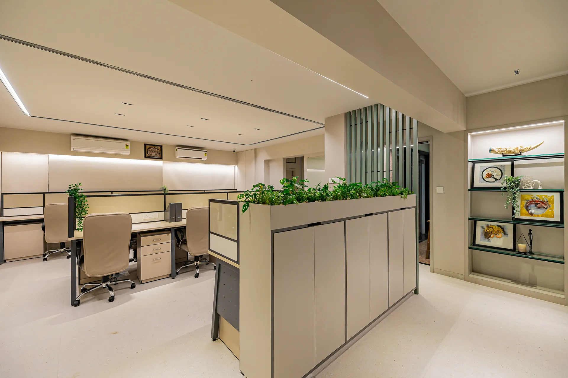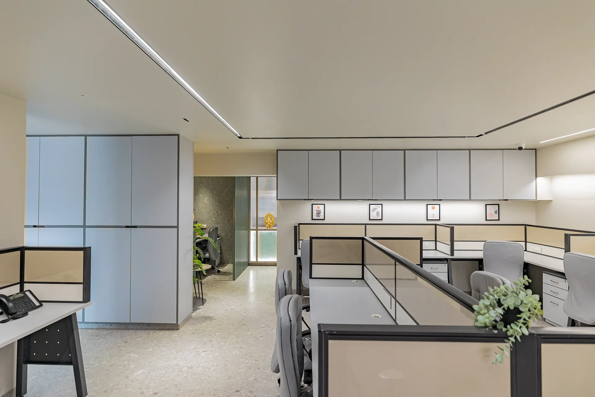 - Volume Management: By utilizing light-reflective surfaces and maintaining a clean horizontal datum, we ensured that the 3,400 sqft space feels airy and balanced, avoiding the “heavy” feeling typically associated with storage-intensive corporate offices.