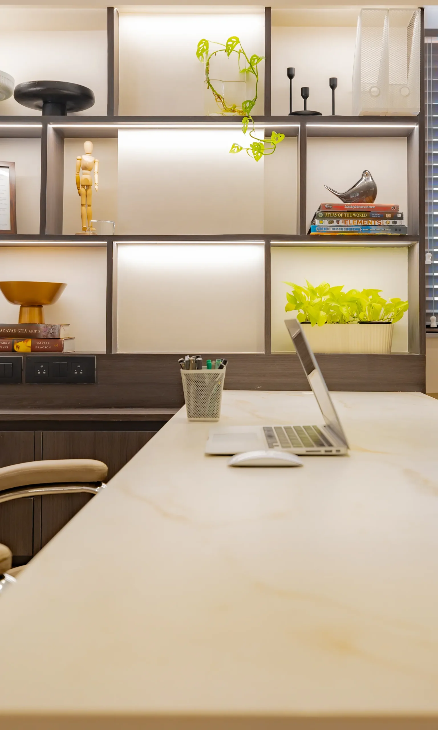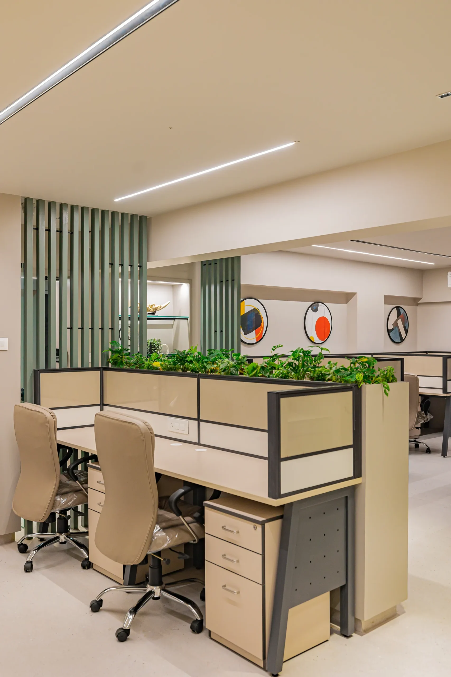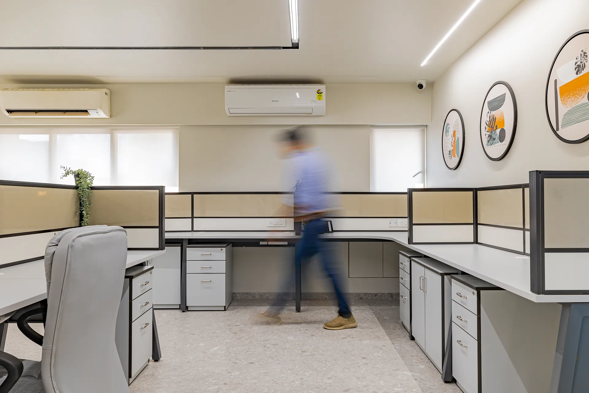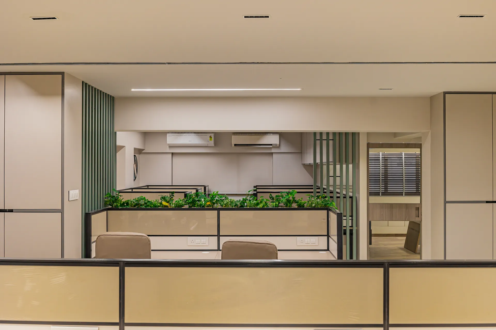 - Volume Management: By utilizing light-reflective surfaces and maintaining a clean horizontal datum, we ensured that the 3,400 sqft space feels airy and balanced, avoiding the “heavy” feeling typically associated with storage-intensive corporate offices.