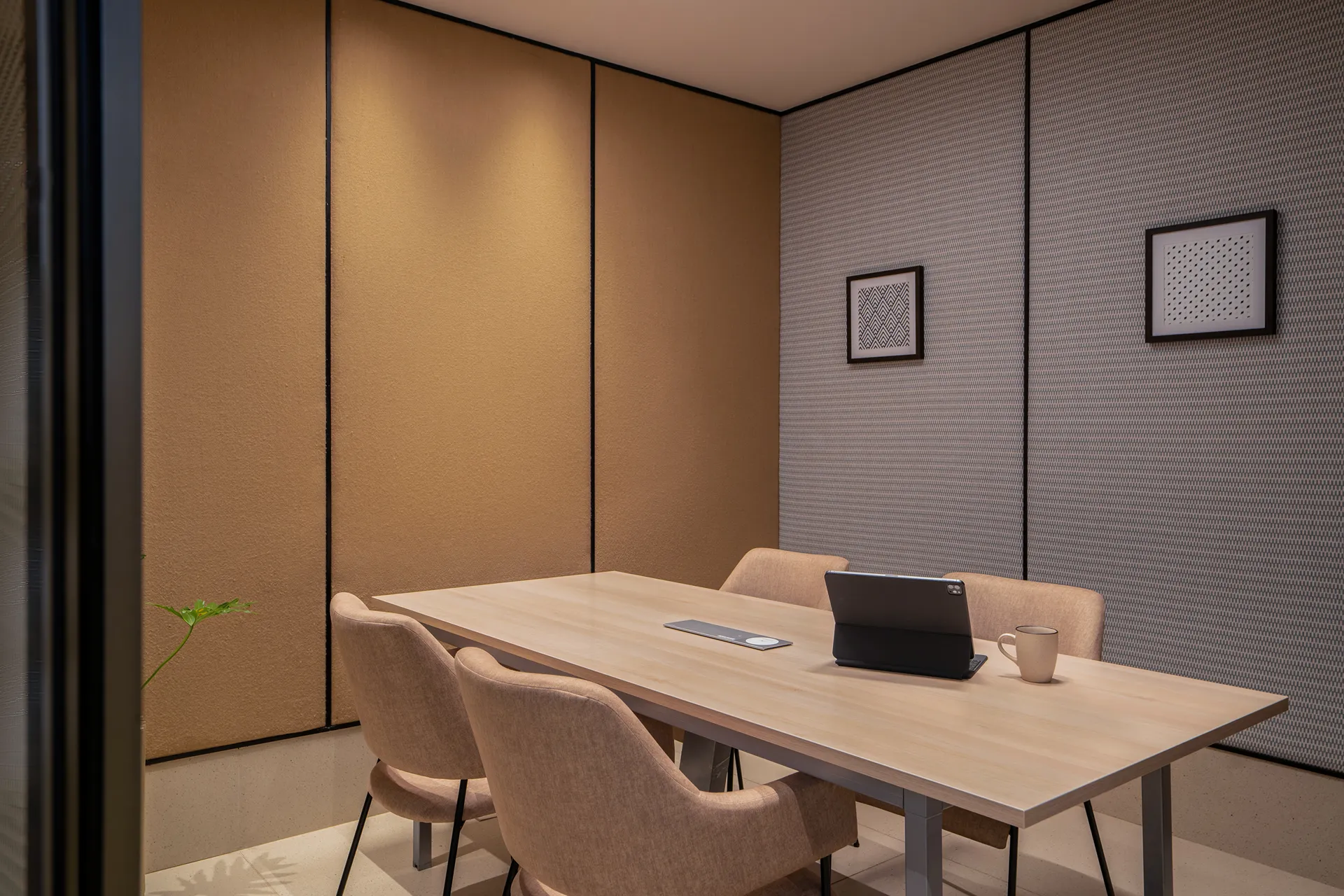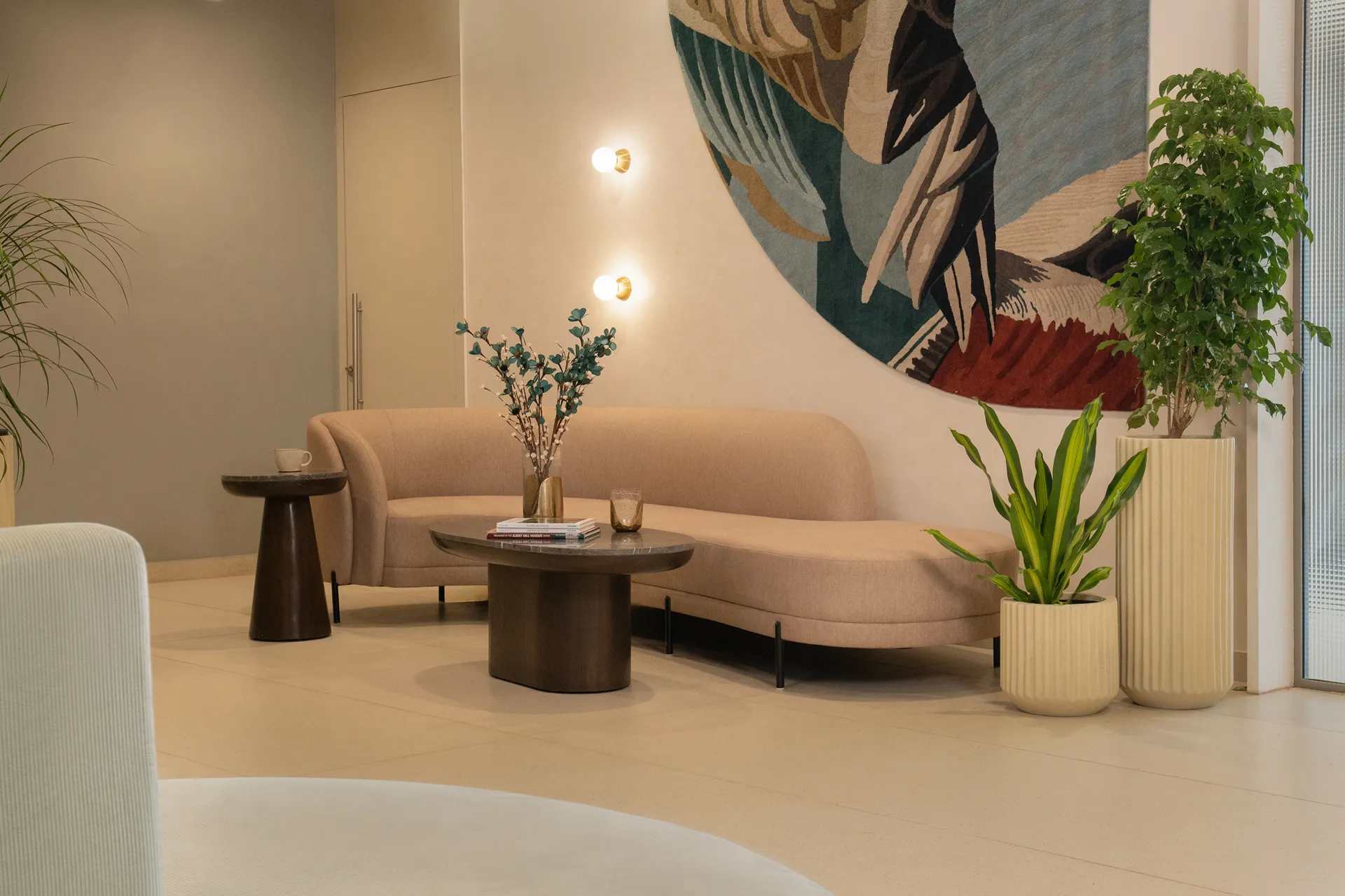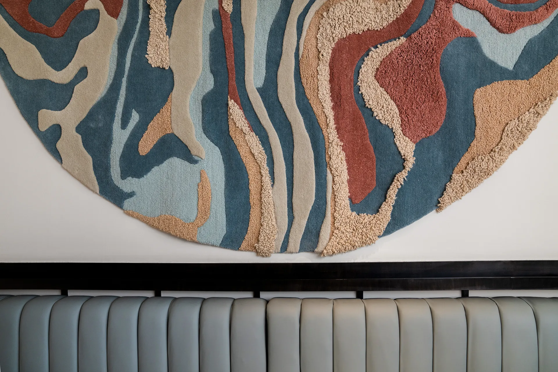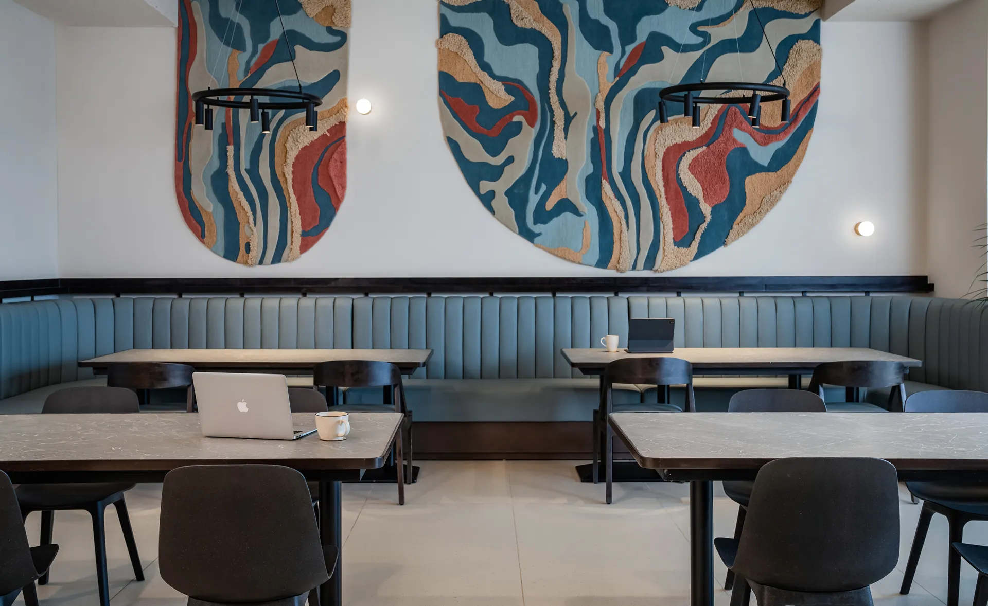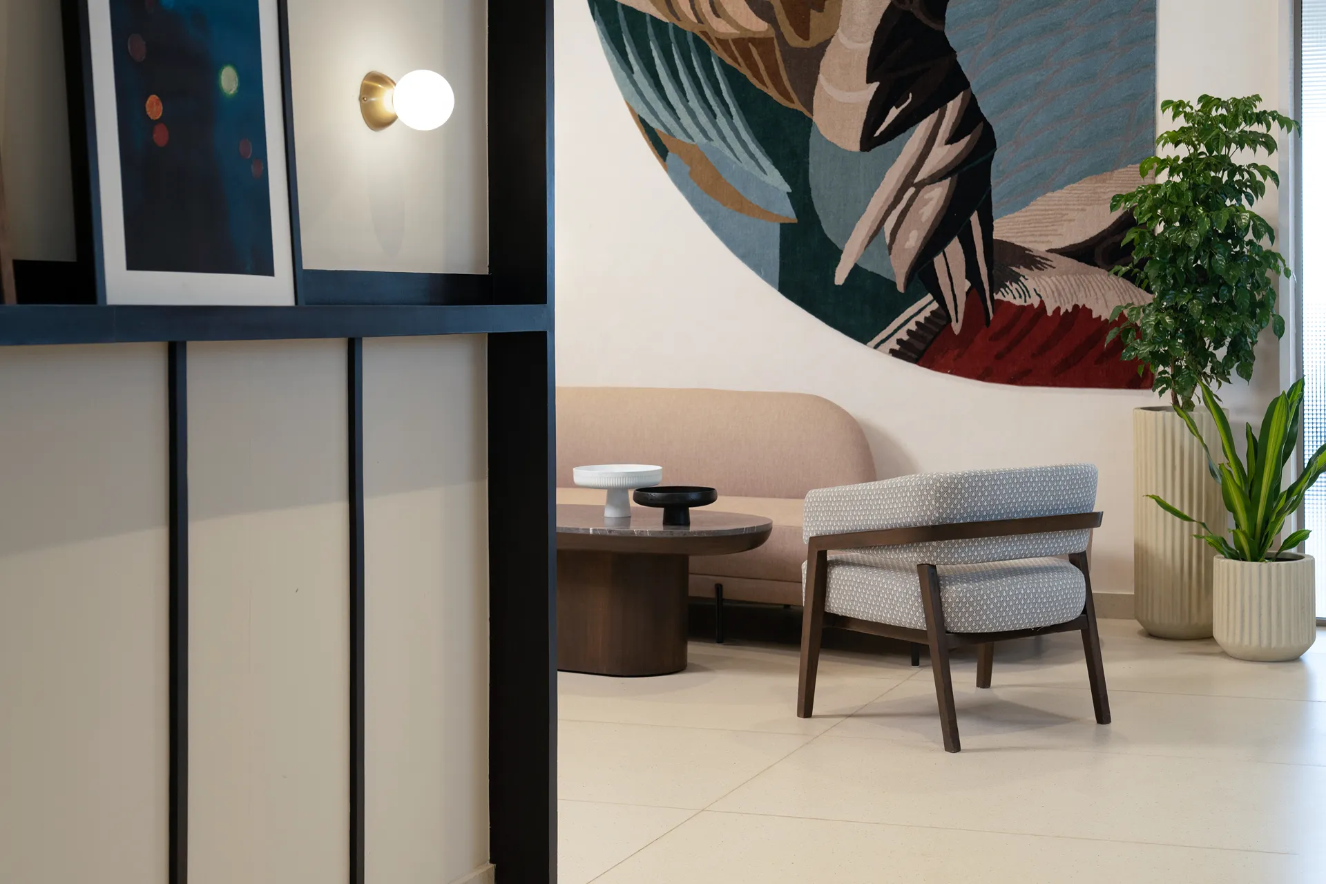 - Artistic Acoustics: In a nod to our Technical Integrity pillar, we utilized heavy-textured rugs as wall-mounted artwork. These pieces double as high-performance acoustic panels, absorbing sound during peak hours without sacrificing the minimalist aesthetic.