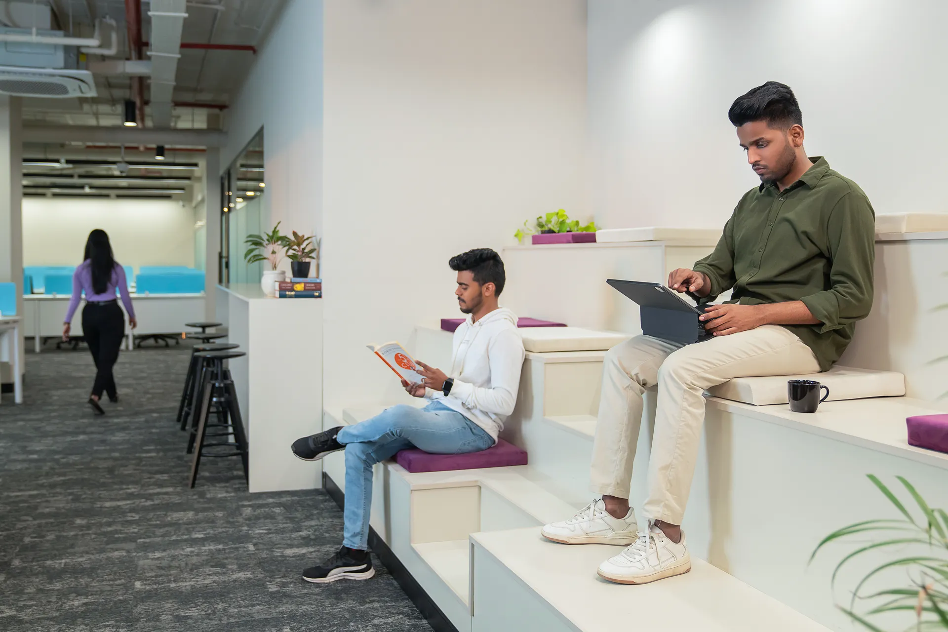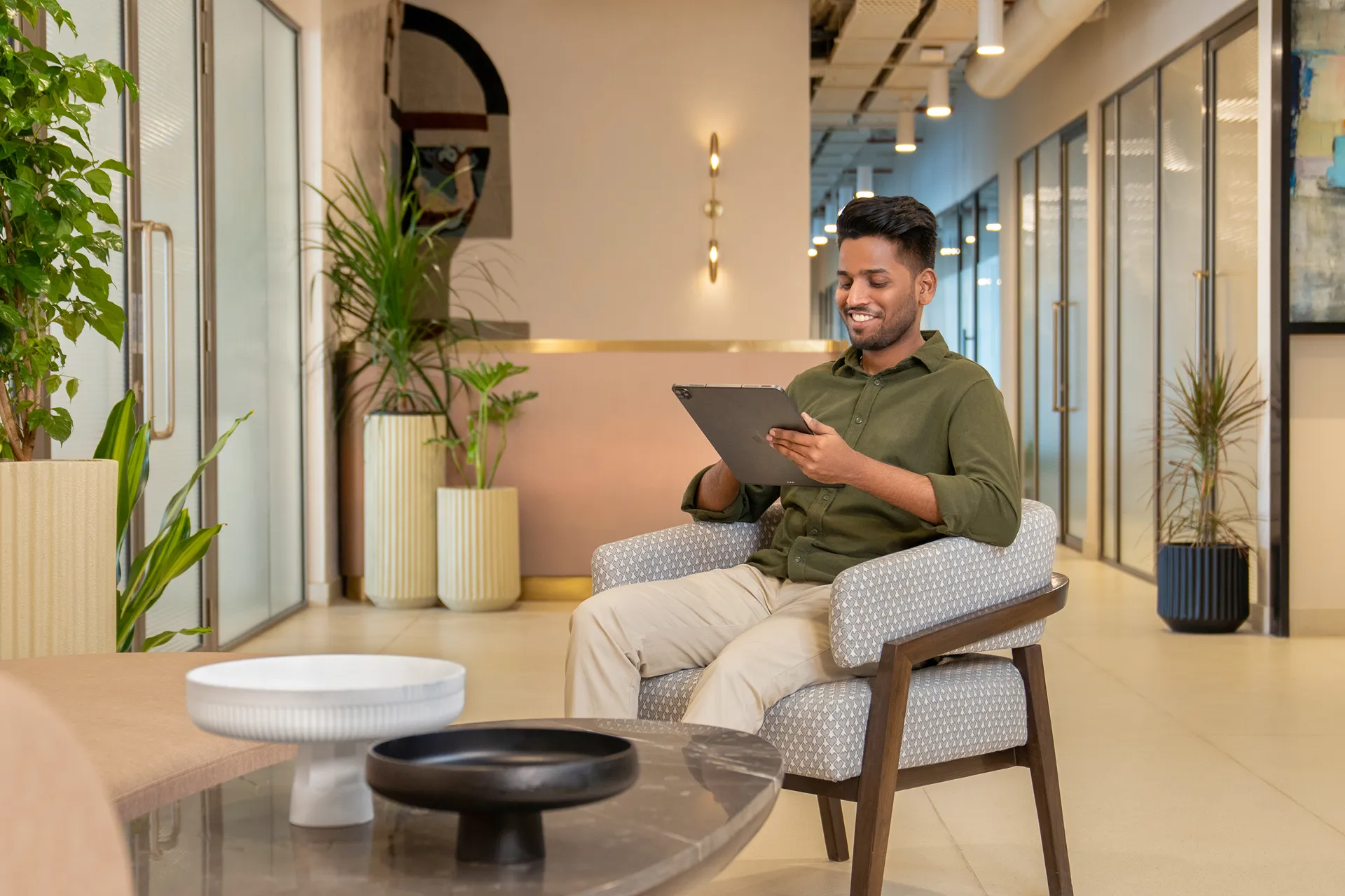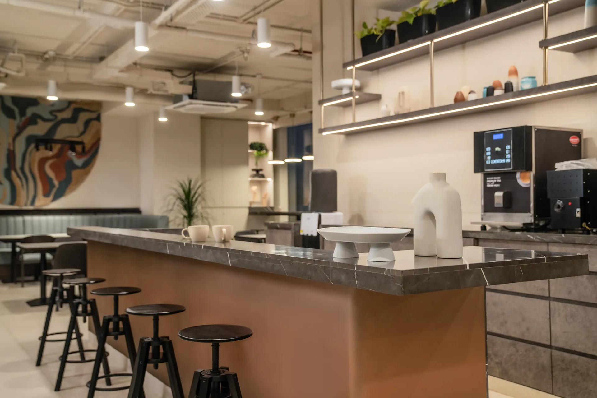 For The Timeless Atrium, we defied the typical co-working stereotype of loud prints and neon lights. The brief called for a space that was sophisticated and sustainable—both in aesthetics and operations. We crafted a “neutral-heavy” environment where earthy tones and raw textures foster a sense of serene focus. By adhering to green building standards and prioritizing operational sustainability, we created a high-traffic haven that feels as calm as it is vibrant.