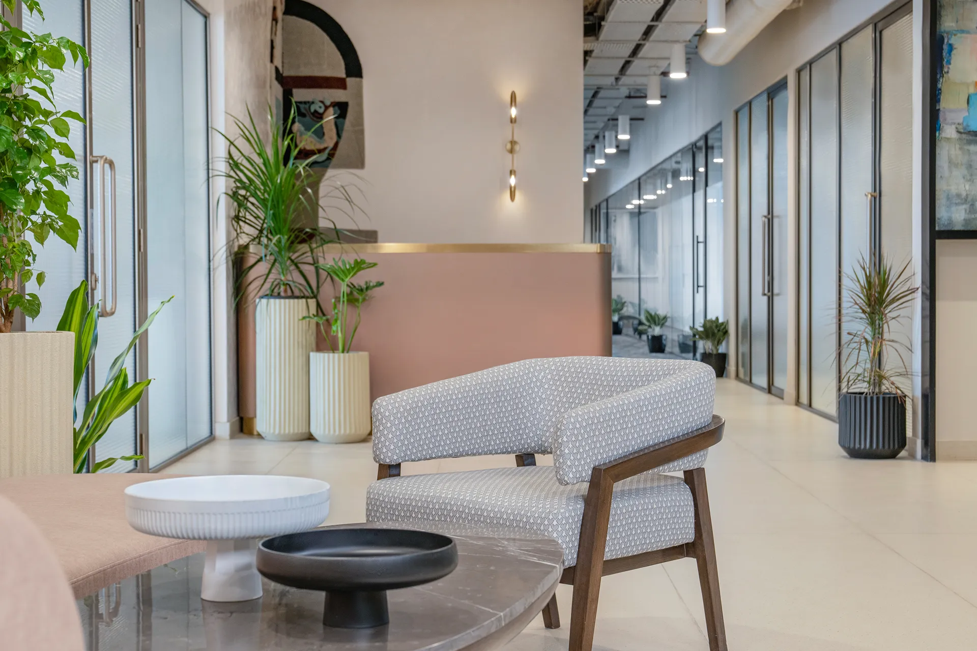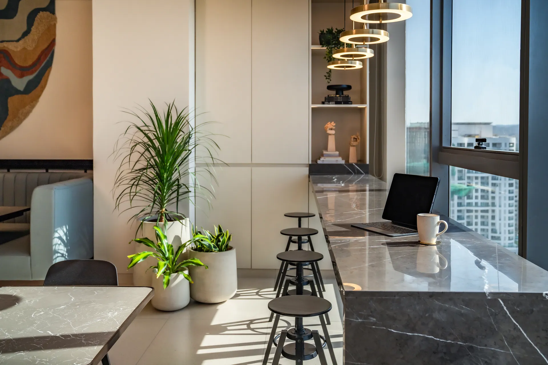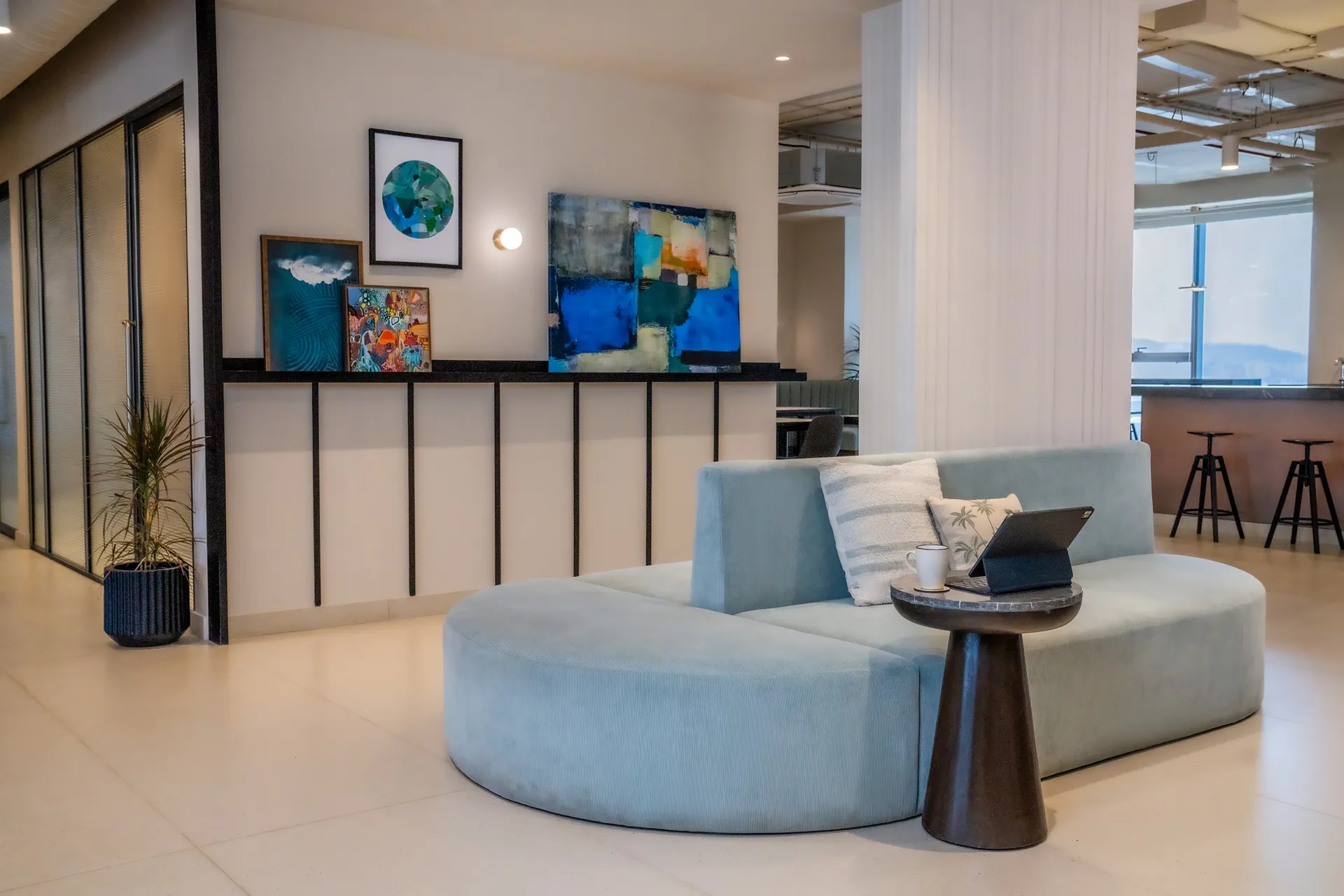 - Columns as Island Sanctuaries: Rather than treating structural columns as obstacles, we used them to carve out “Island Seating.” These enclaves serve as private meeting nooks and a viewing gallery for art, turning structural necessity into an architectural asset.