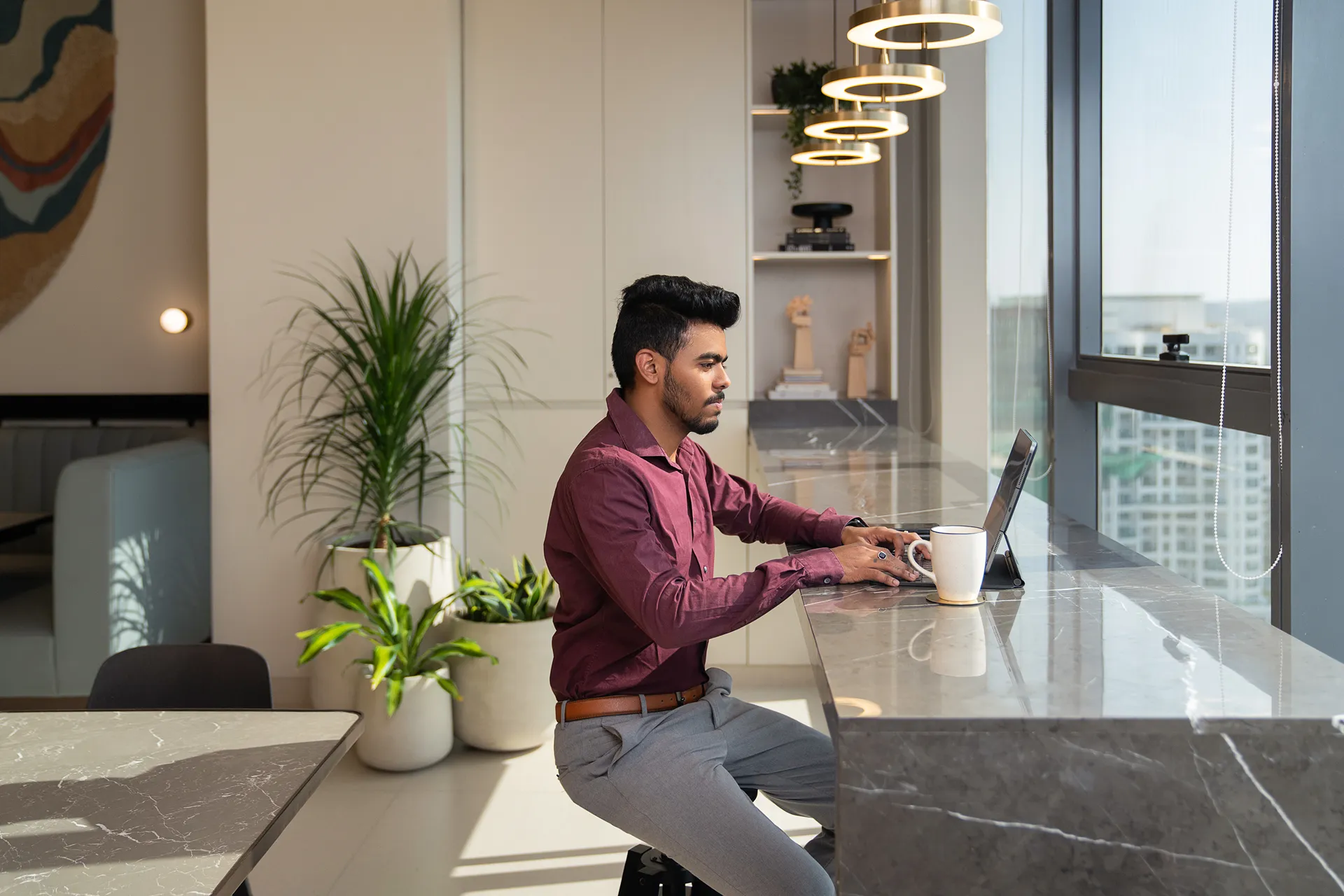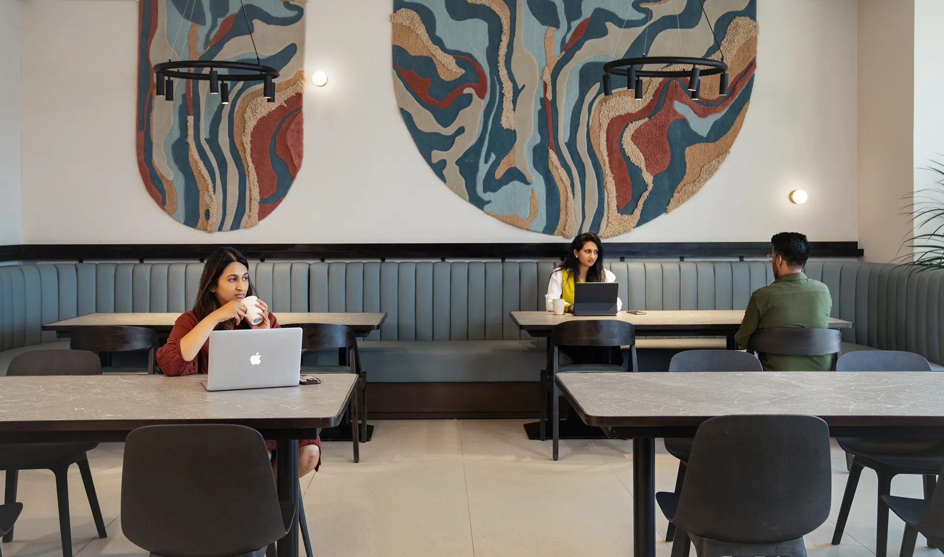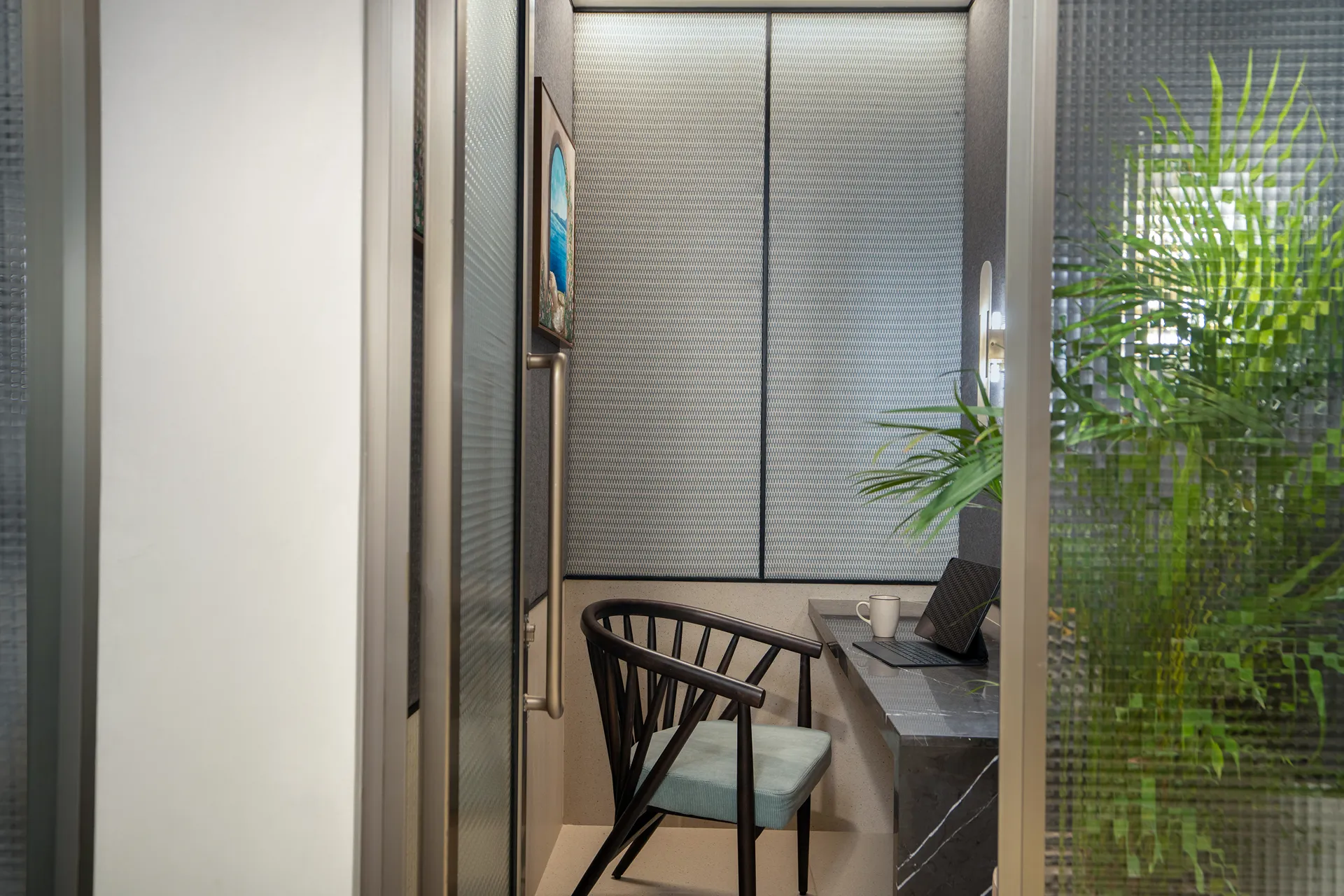 - Columns as Island Sanctuaries: Rather than treating structural columns as obstacles, we used them to carve out “Island Seating.” These enclaves serve as private meeting nooks and a viewing gallery for art, turning structural necessity into an architectural asset.