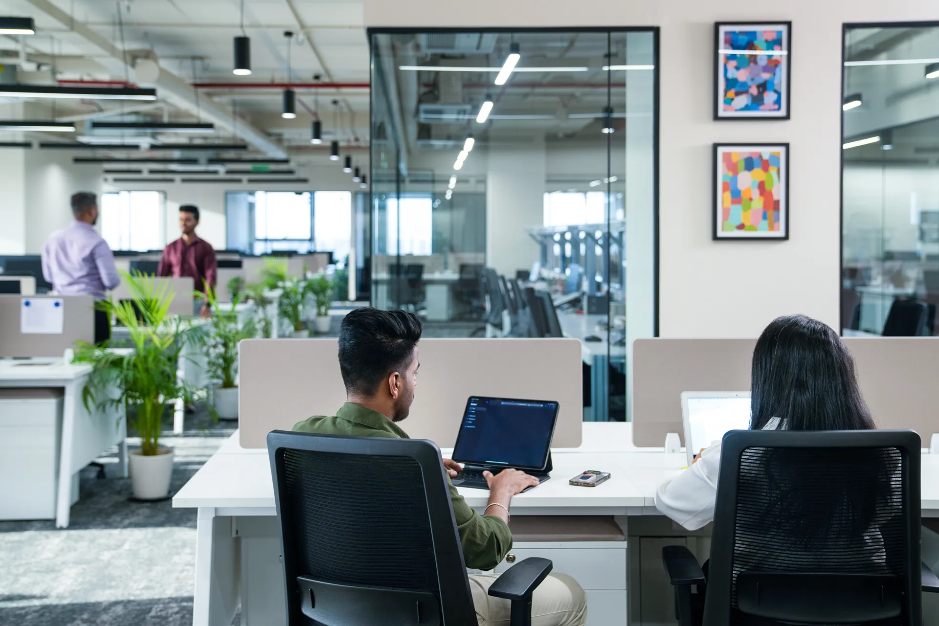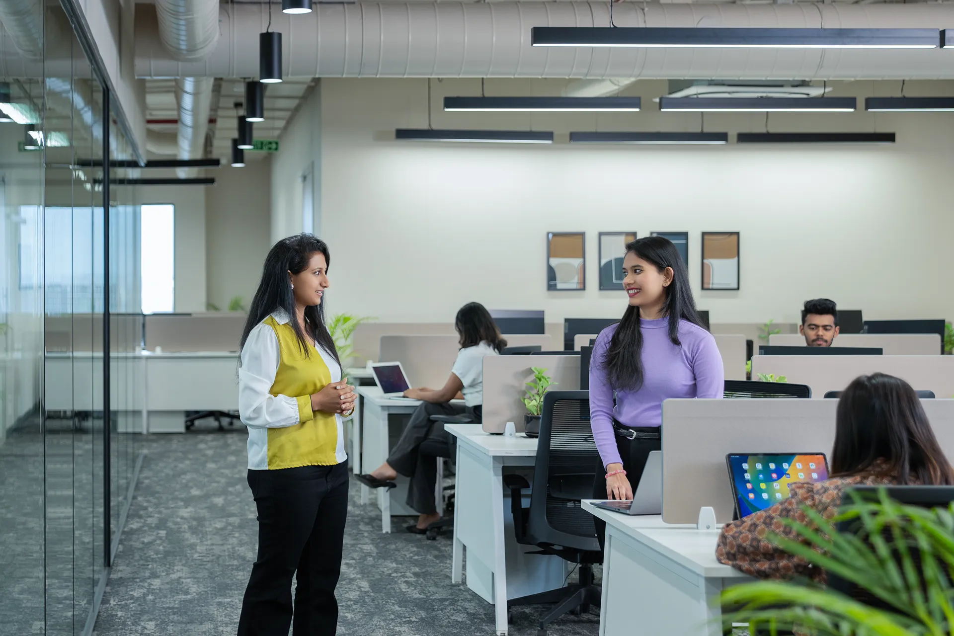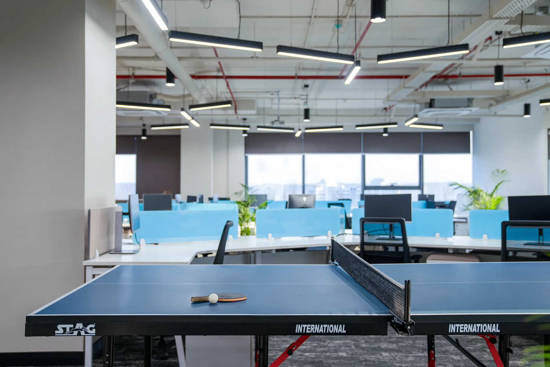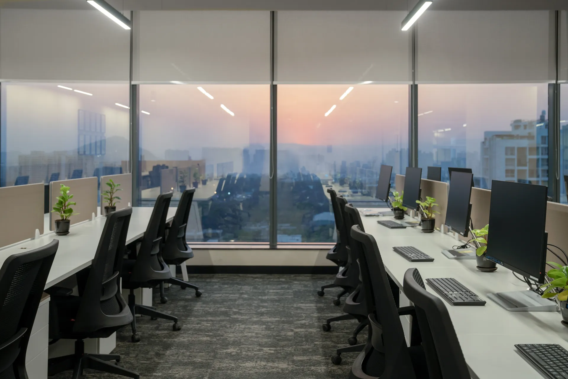 - Glare-Conscious Orientation: Following a rigorous site analysis of the linear rectangular floor plate, we strategically positioned workstations so employees face away from the north-facing glazing. This maximizes natural light while eliminating screen glare, ensuring all-day visual comfort.